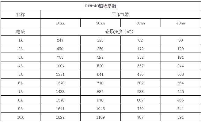 PEM-40小型電磁鐵/U型電磁場(chǎng)發(fā)生器的氣隙磁場(chǎng)是根據電磁感應原理,電流源對磁場(chǎng)線(xiàn)包供直流電流,并由導磁回路聚磁產(chǎn)生強磁場(chǎng),調節氣隙大小,改變極面直徑,調整工作電流均可改變工作氣隙磁場(chǎng)的大小。